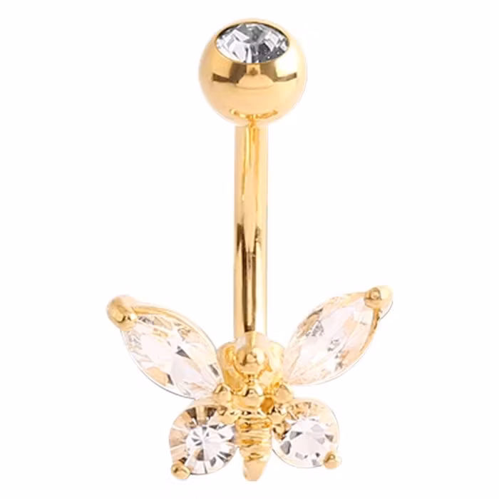 Hem › Navel › Guldig navelpiercing med en fjäril 1,6x10 mm Guldig navelpiercing med en fjäril 1,6x10 mm 0 kr 229 kr Produkten är tyvärr slut i lager. :( Guldig navelpiercing med en fjäril i vita kristallstenarKirurgiskt stål1,6x10 mm
