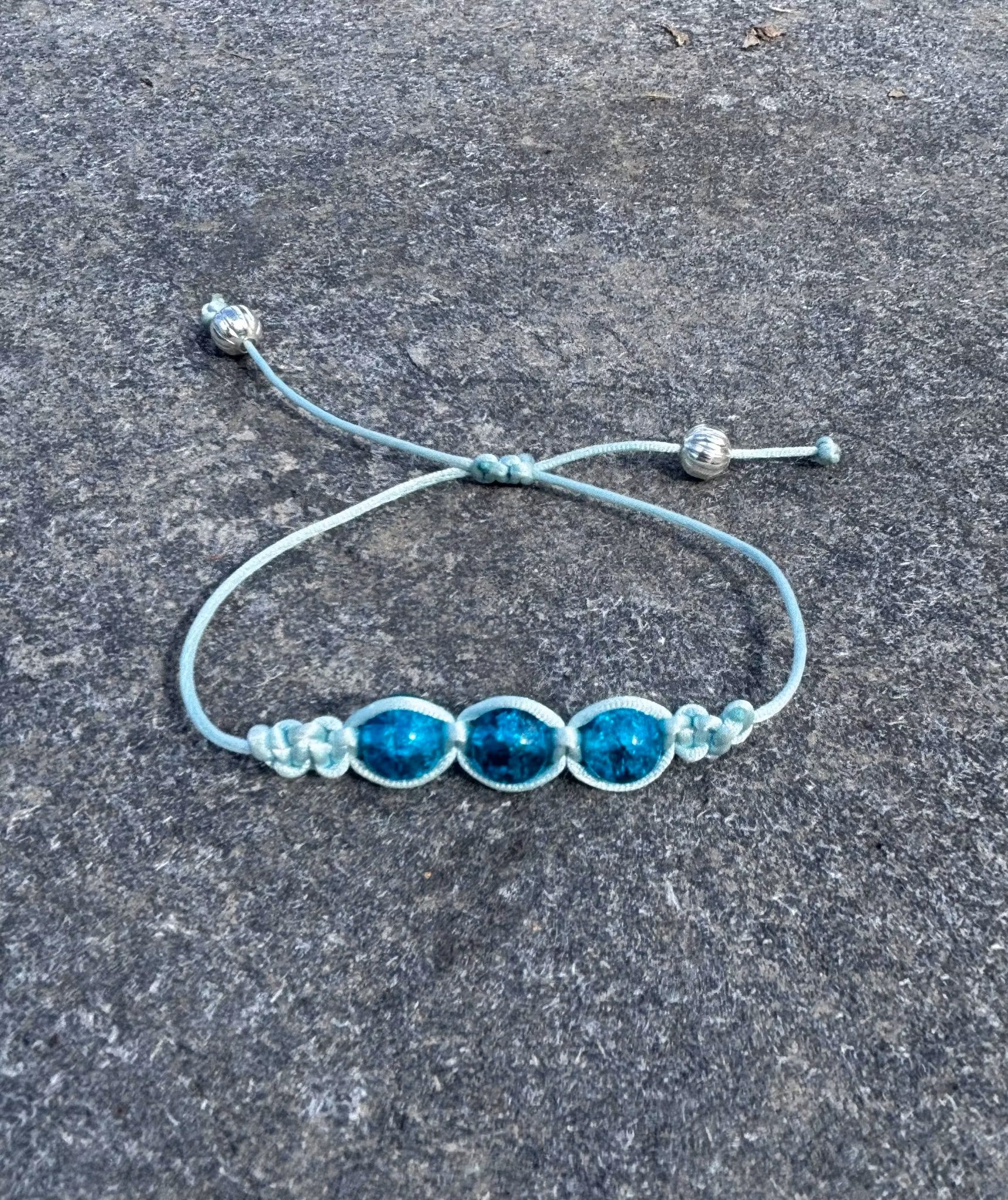 Turkost justerbart makrame armband gjort i nylon, med tre krackelerade glaspärlor