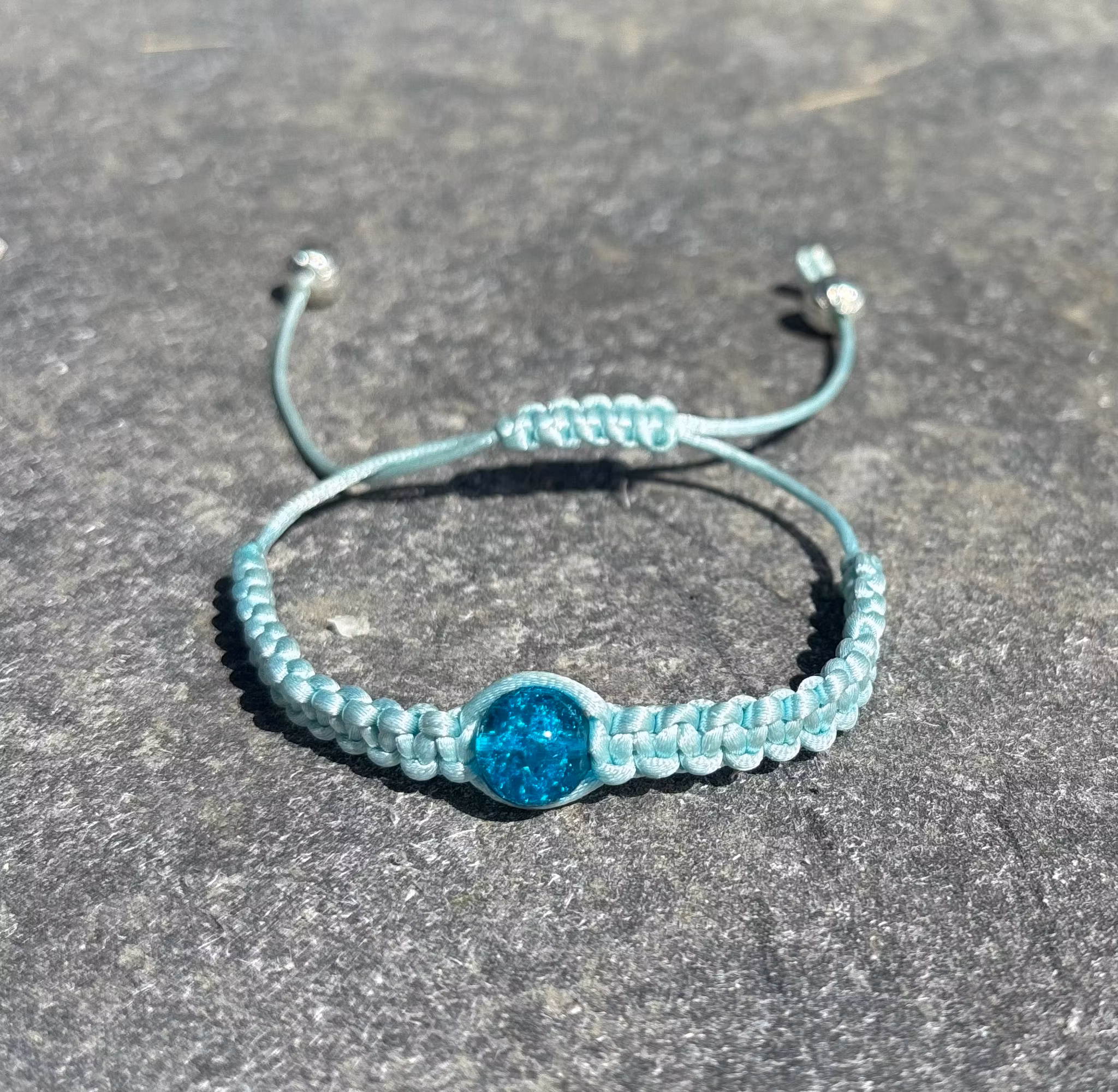 Turkost justerbart makrame armband gjort i nylon, med en krackelerad glaspärla