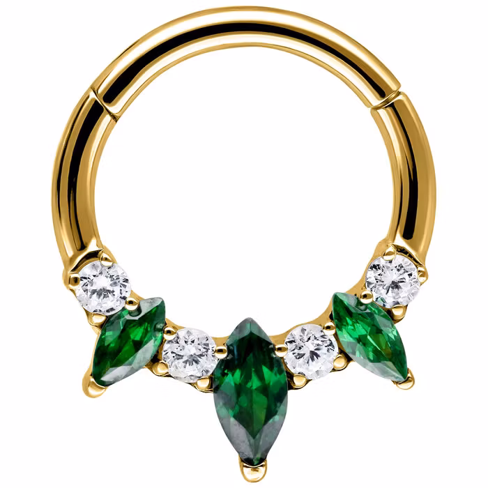 Guldig ring med vita stenar och diamantformade emerald stenar