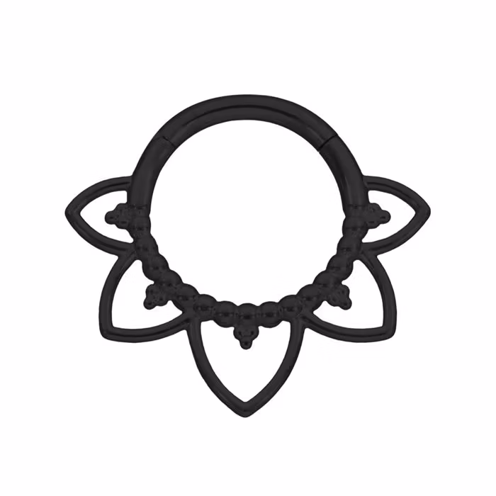 Svart ring med blomliknande detaljer