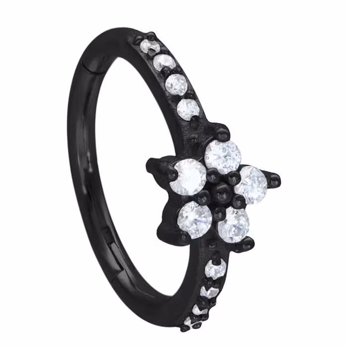 Vacker svart ring med vita stenar och en blomma, olika storlek